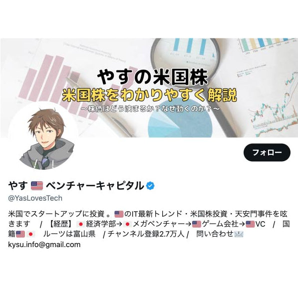アメリカのIT最新トレンドや米国株・投資情報を中心に発信しています。総フォロワー数は14万人超。日本で経済学部を卒業後、システムエンジニアとしてキャリアをスタート。2014年に渡米し、現在は米国VCとしてスタートアップ投資に従事しています。